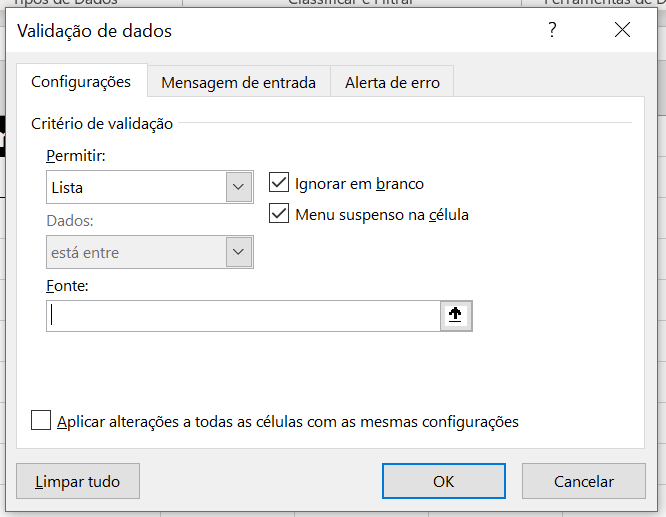 Neste campo iremos referir onde estão nossos dados da lista. Iremos indicar ao Excel para expandir esta lista à medida que inserirmos dados.